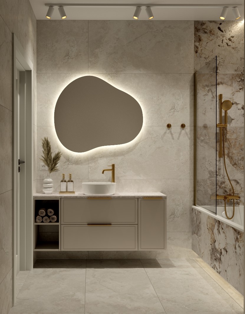 Istotną rolę odgrywa także oświetlenie. Podświetlenie LED przy lustrze i w strefie zabudowy nie tylko buduje klimat, ale też podkreśla strukturę materiałów. Nieregularne lustro z delikatnym światłem dodaje lekkości i przełamuje proste linie, dzięki czemu wnętrze nie jest monotonne.