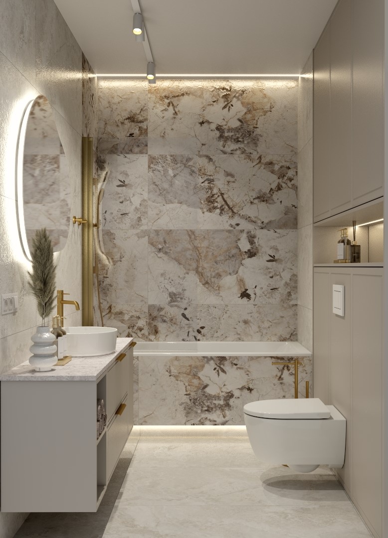Żeby jednak wnętrze nie było zbyt zachowawcze, pojawił się mocniejszy akcent w strefie wanny. Marmurowa ściana o wyrazistym rysunku nadaje charakter i przyciąga uwagę od pierwszego spojrzenia. Ten zabieg pozwala stworzyć efektowną przestrzeń bez przesady. Jedna dekoracyjna ściana w zupełności wystarczy, aby całość nabrała indywidualnego stylu.