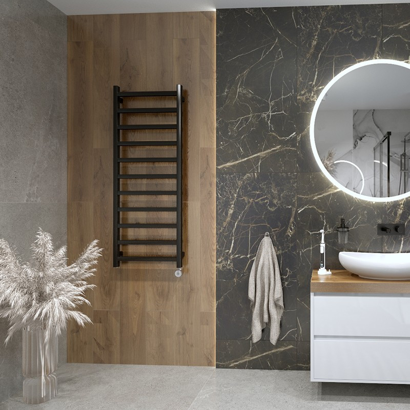 Elektryczny grzejnik łazienkowy Lungo Black 1320 z wbudowaną grzałką Black to doskonałe rozwiązanie zapewniające wygodne i efektywne ogrzewanie. Jego matowe, czarne wykończenie dodaje wnętrzu elegancji i nowoczesności, idealnie wpasowując się w różnorodne aranżacje wnętrz. Urządzenie wykonane jest z wytrzymałej stali niskowęglowej, która nie tylko szybko się nagrzewa, ale również gwarantuje długotrwałe użytkowanie.