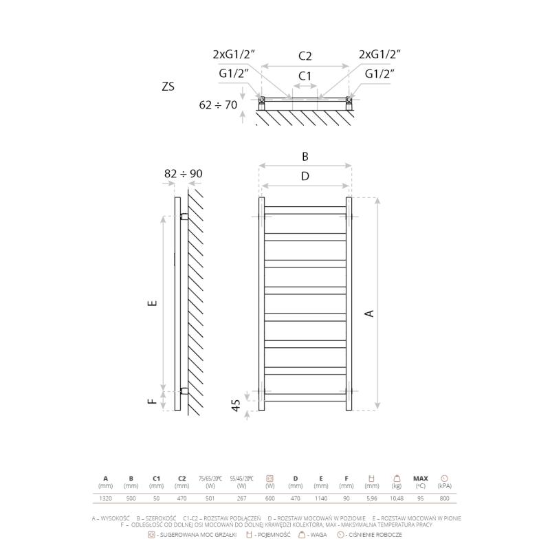 Elektryczny grzejnik łazienkowy Lungo Black 1320 z grzałką Black posiada wymiary 1320 mm x 500 mm, dzięki czemu jest idealnym wyborem do przestronnych łazienek. Jego konstrukcja pozwala na pracę pod ciśnieniem do 800 kPa, co zapewnia solidność i bezpieczeństwo użytkowania. Grzejnik może osiągnąć maksymalną temperaturę 95°C, umożliwiając szybkie i skuteczne dogrzewanie pomieszczenia. Jego pojemność wynosi 5,96 dm?, co sprzyja długotrwałemu utrzymywaniu ciepła. Model oferuje moc 501 W przy temperaturach 75/65/20°C oraz 267 W przy 55/45/20°C. Dzięki dedykowanej grzałce Black, użytkownik zyskuje większą kontrolę nad temperaturą w łazience. Swoimi możliwościami oraz nowoczesnym designem, grzejnik ten stanowi idealny wybór dla osób poszukujących skutecznego i stylowego rozwiązania do ogrzewania łazienki.