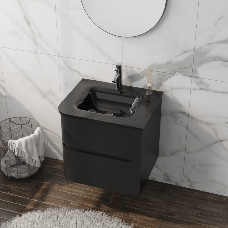 Nasza czarna matowa szafka o szerokości 60 cm doskonale łączy nowoczesny styl z funkcjonalnością i wyszukanym designem. Współczesna łazienka przekracza swoje tradycyjne funkcje, stając się miejscem odpoczynku i relaksacji. Dlatego aranżacja tego pomieszczenia staje się kluczowa, a wybór odpowiednich mebli łazienkowych jest nie do przecenienia. Jednym z najmodniejszych rozwiązań jest właśnie czarna matowa szafka o szerokości 60 cm. Wyposażona w dwie szuflady, pozwala na efektywne przechowywanie ręczników, kosmetyków i innych niezbędnych przedmiotów. Dzięki niej wszystko jest w zasięgu ręki. Szafka wykonana jest z trwałego PVC, co zapewnia jej wytrzymałość na wilgoć i uszkodzenia, gwarantując długą żywotność. Matowa powierzchnia jest łatwa do utrzymania w czystości; wystarczy przetrzeć wilgotną ściereczką, by zachować jej elegancki wygląd.