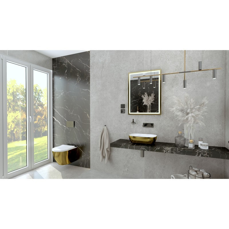Wisząca miska WC SOFI SLIM BRUSHED GOLD to harmonijne połączenie klasycznej bieli z nowoczesnym, szczotkowanym złotem. Jej design zachwyci i uświet