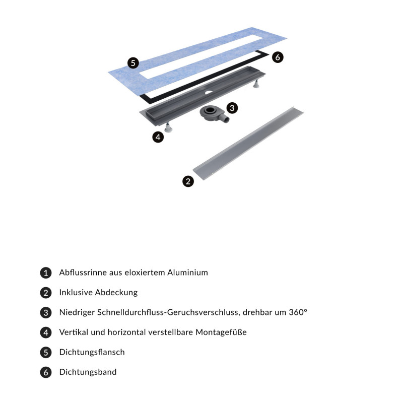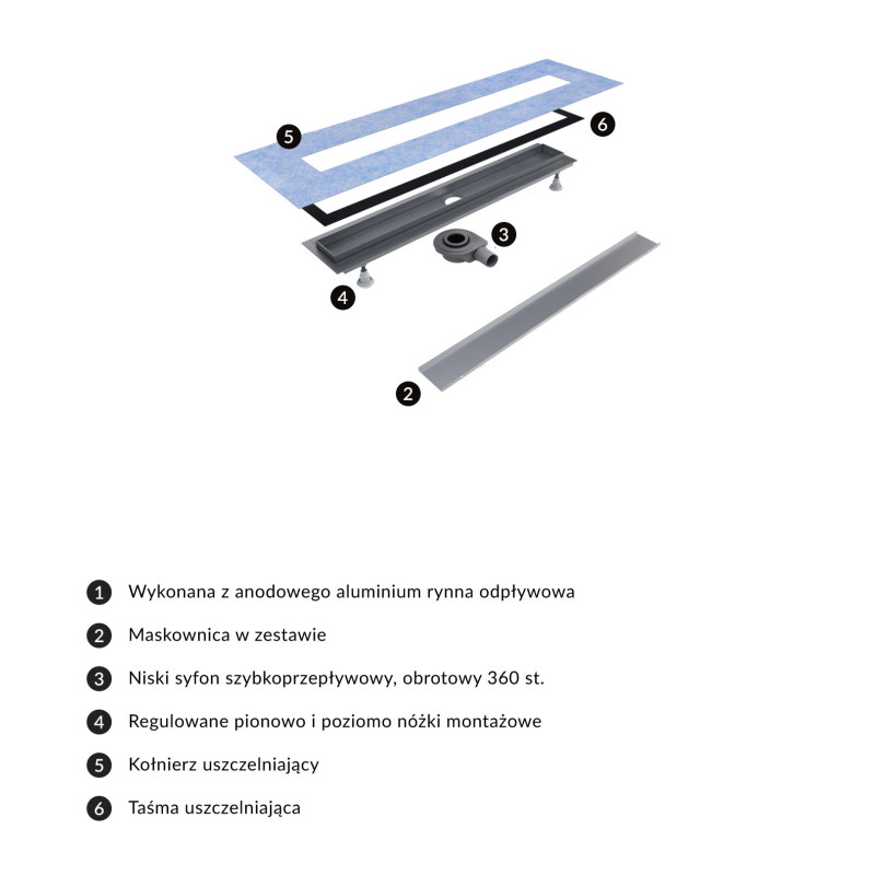 rynna odpływowa oraz maskownica wykonana z anodowanego aluminium