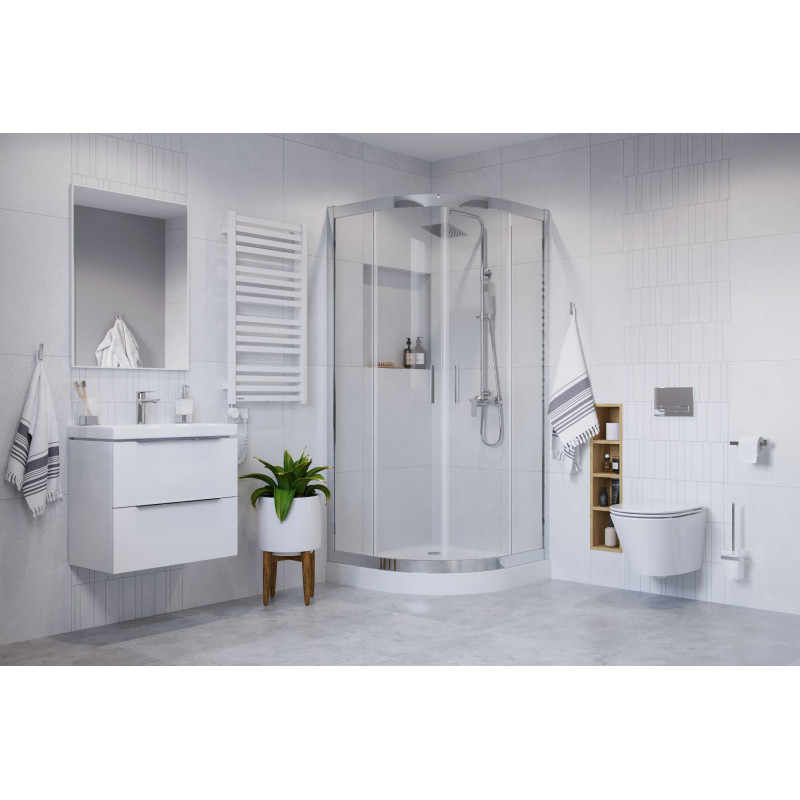 Model Sense to brodzik projektowany specjalnie do kabin o półokrągłym kształcie z promieniem łuku wynoszącym 550 mm. Brodzik dostępny jest w trzech wymiarach: 800 x 800, 900 x 900 oraz 1000 x 1000mm. Oferowany jest w dwóch wariantach: niskim (40 mm) oraz wysokim (Compact 110 mm).
