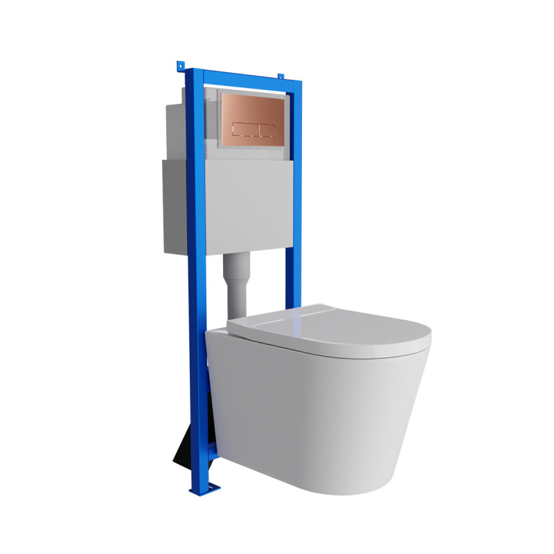 Homelike Zestaw WC 4 w 1 – WC wiszące Versoni 3.0 Tornado + przycisk spłukujący HOM 101.3.6 w kolorze Miedź szczotkowana prostokątny | zestaw kompletny | spłuczka podtynkowa | komplet toalety