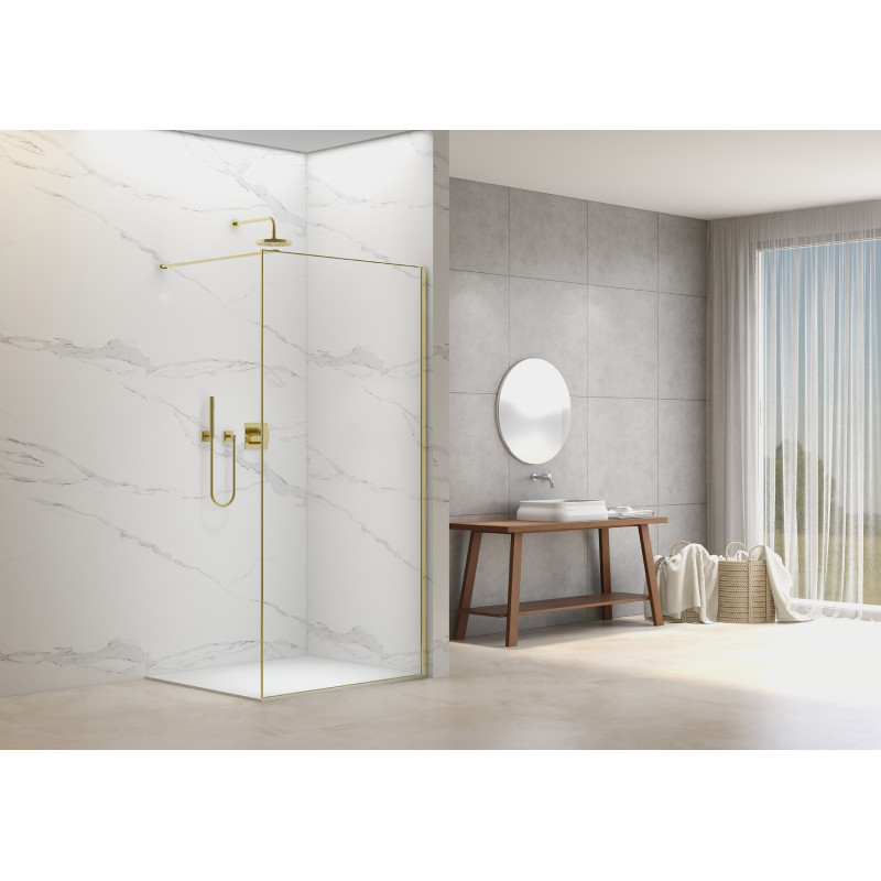 Kabina Tygodnia to elegancka kabina typu walk-in, która łączy minimalistyczny design z luksusowym wykończeniem. Złoty kolor nadaje wnętrzu wyjątkowego charakteru i doskonale wpisuje się w aktualne trendy aranżacyjne. Prosta, otwarta forma sprawia, że przestrzeń łazienki wydaje się większa i bardziej nowoczesna.