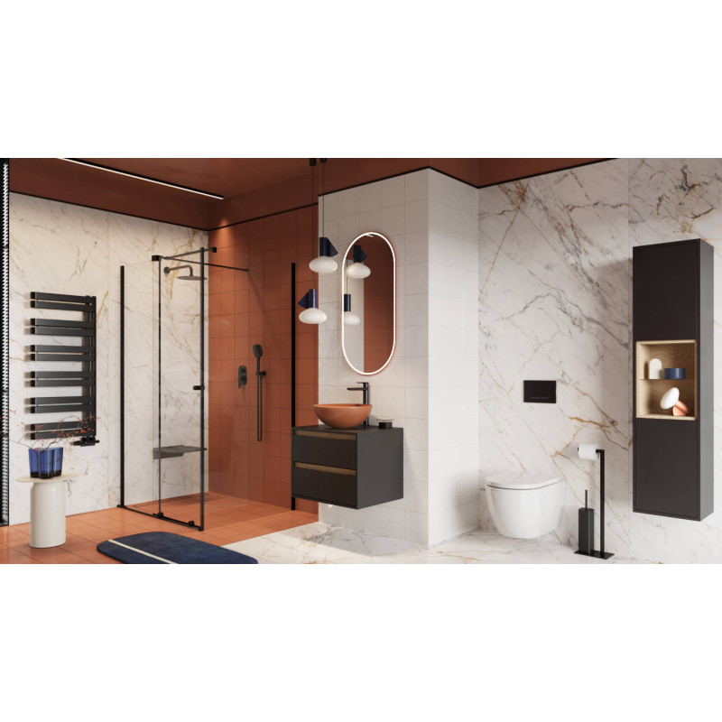 Przycisk został zaprojektowany w duchu minimalizmu, stąd cała obudowa wystaje tylko o 6 mm nad powierzchnię płytki. Model ten jest dostępny w różnych kolorach do wyboru: chrom, biały połysk, czarny mat, złoty połysk, złoty szczotkowany i miedziany szczotkowany.
