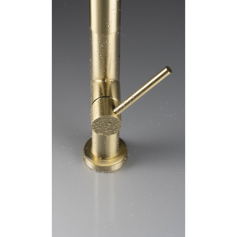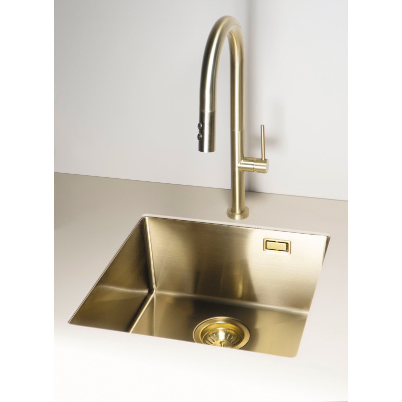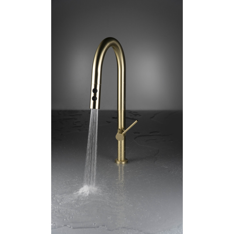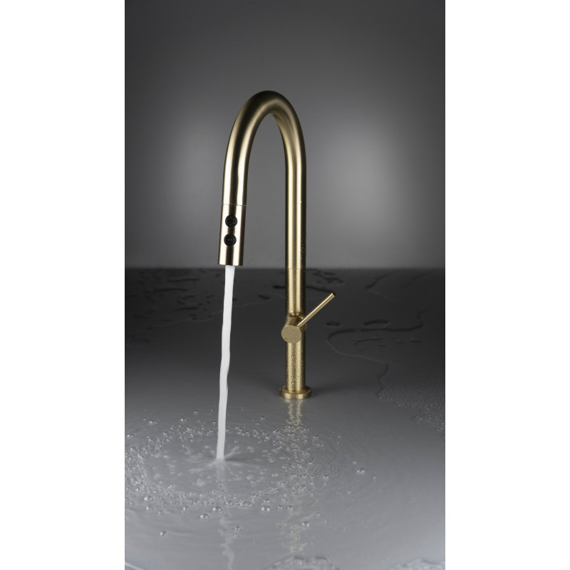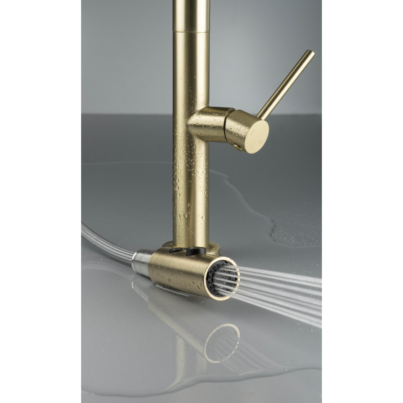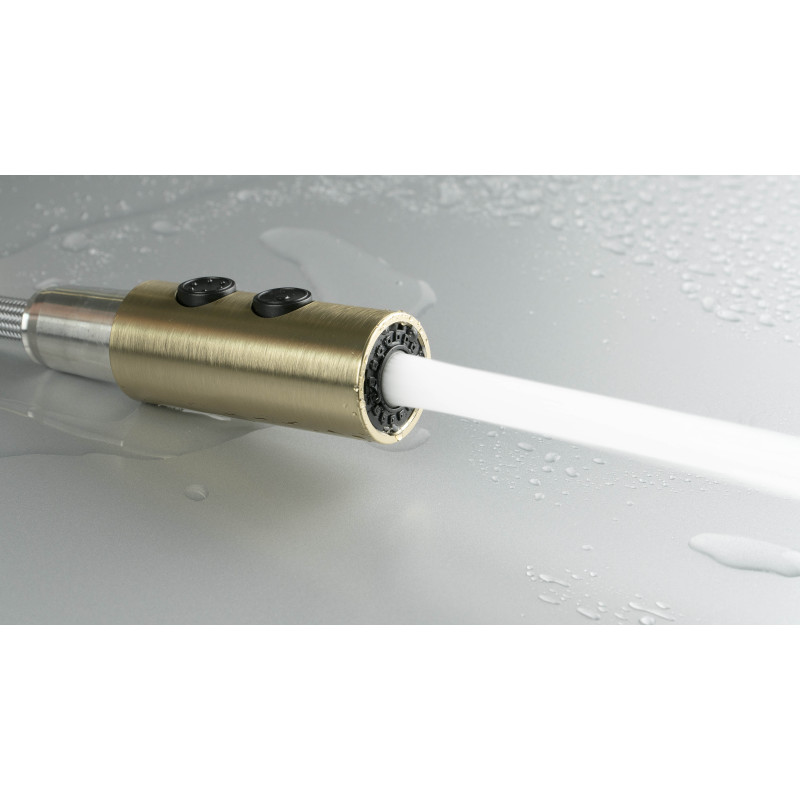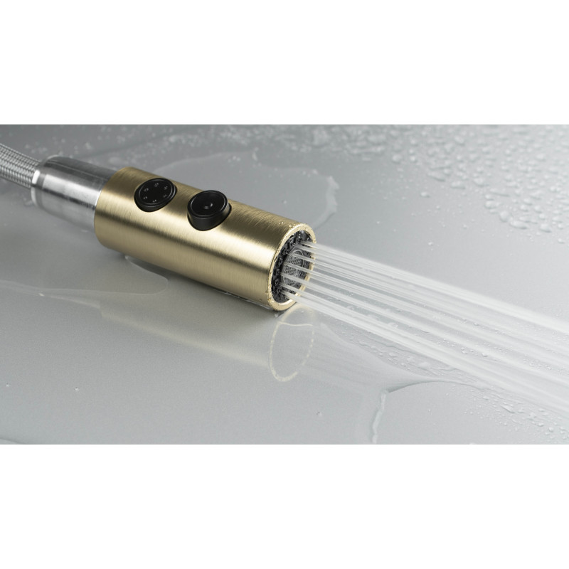 Elegancja połączona z codzienną wygodą. Bateria Olfato w wykończeniu złoto szczotkowane subtelnie podkreśla charakter nowoczesnej kuchni, nie przytłaczając wnętrza. Wyciągana wylewka na elastycznym wężu ułatwia sprzątanie strefy zlewu, napełnianie wysokich garnków oraz szybkie opłukiwanie warzyw i owoców.