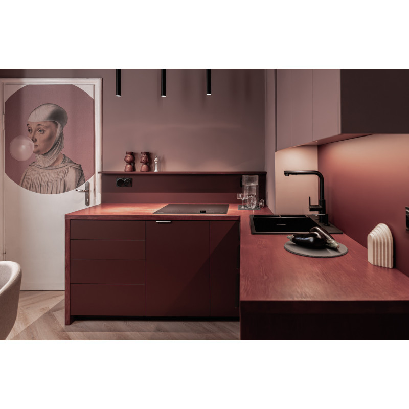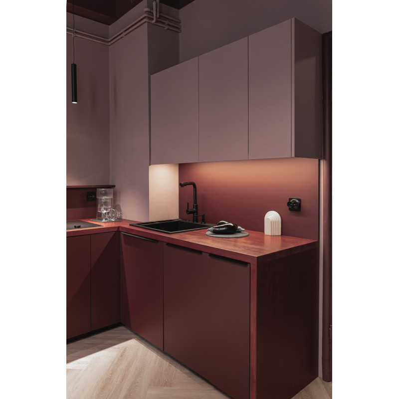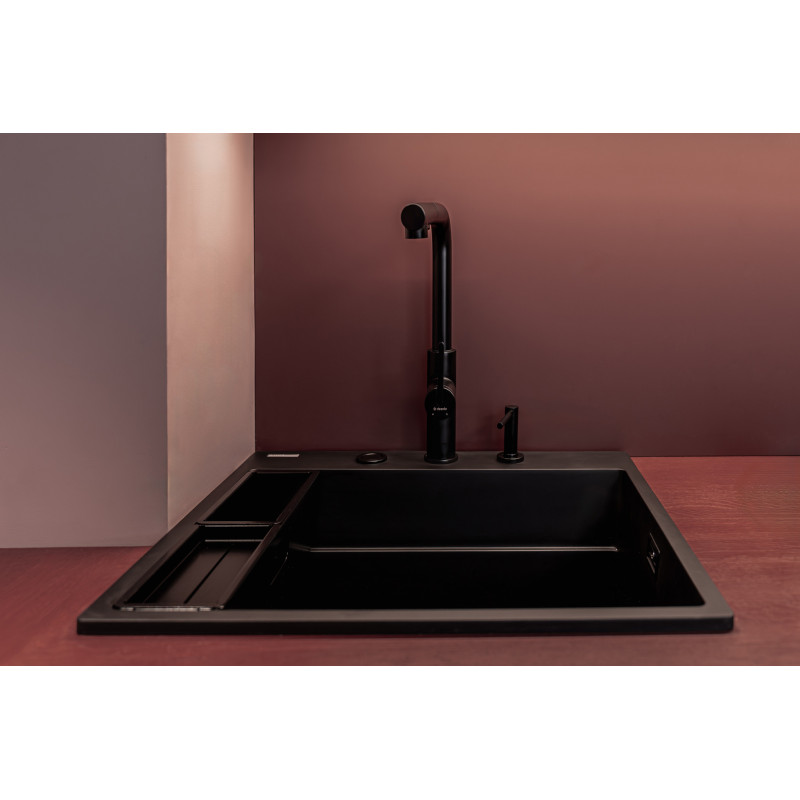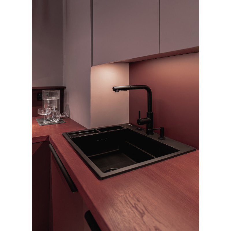Elegancka bateria kuchenna Momi łączy oszczędny design z codzienną wygodą. Korpus wykonano z wysokogatunkowej stali nierdzewnej 304, a matowe wykończenie nero podkreśla nowoczesny charakter i ułatwia utrzymanie czystości. Dzięki przemyślanym funkcjom model ten świetnie sprawdzi się zarówno w małych, jak i dużych kuchniach.
