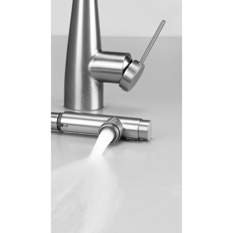 Wbudowany aerator napowietrza strumień, dzięki czemu woda płynie miękko i zużywasz jej mniej bez utraty komfortu. Model wyróżnia także funkcja podłączenia do filtra wody – dedykowany wężyk poprowadzony wewnątrz wylewki doprowadza przefiltrowaną wodę bezpośrednio z filtra. Jedno naciśnięcie przycisku Click na szczycie wylewki wystarczy, aby sięgnąć po czystą, filtrowaną wodę.