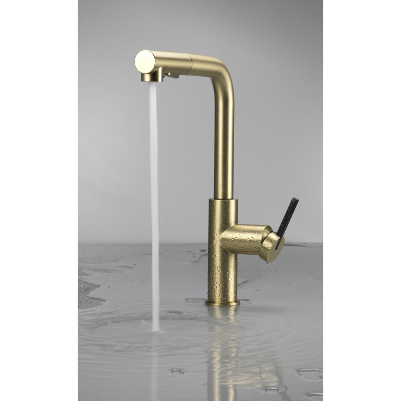 Elegancka bateria kuchenna Momi łączy nowoczesny wygląd z najwyższą funkcjonalnością. Korpus i wylewka wykonane są z trwałej stali nierdzewnej 304, a wykończenie w odcieniu szczotkowanego złota nadaje kuchni szlachetnego charakteru i jest łatwe w utrzymaniu czystości. Jednouchwytowa, stojąca konstrukcja zapewnia wygodną obsługę na co dzień, a przemyślane detale poprawiają komfort pracy przy zlewie.
