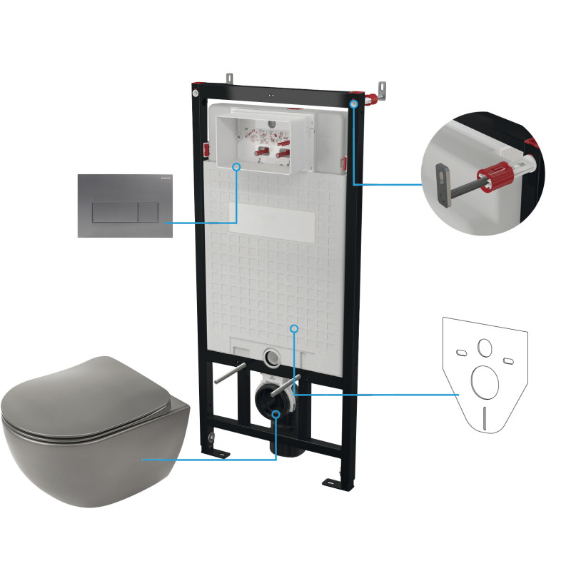Styl, higiena i funkcjonalność w jednym zestawie. Komplet Peonia w wykończeniu titanium to przemyślane rozwiązanie do nowoczesnych łazienek. W skład wchodzi wisząca, bezkołnierzowa miska WC z trwałej ceramiki, smukła deska wolnoopadająca typu slim, dopasowany przycisk spłukujący oraz solidny stelaż podtynkowy. Montaż na ścianie pozwala odzyskać przestrzeń i podkreśla minimalistyczny charakter wnętrza, a oszczędne, podwójne spłukiwanie wspiera mniejsze zużycie wody.