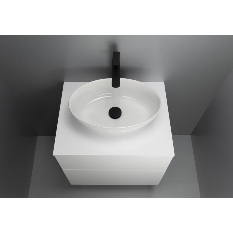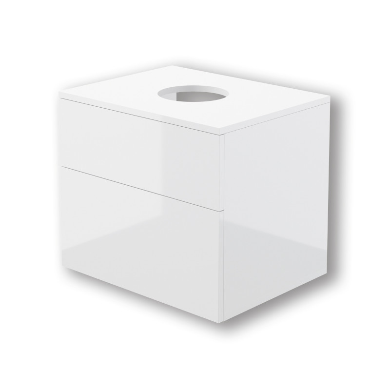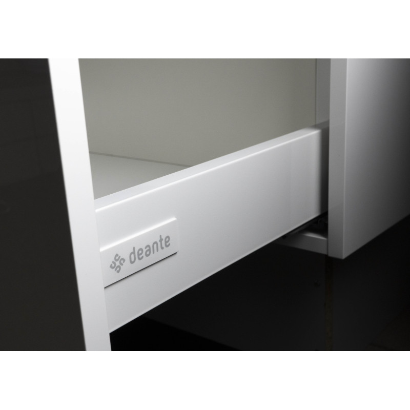 Model wyposażono w dwie pojemne szuflady otwierane dotykiem (push-to-open). Mechanizmy SlowMotion z pełnym wysuwem zapewniają płynne działanie i wygodny dostęp do całej zawartości. Górna szuflada ma fabryczne wycięcie na syfon, a w komplecie znajduje się obudowa syfonu oraz lakierowany blat – idealny pod umywalki stawiane na blacie.