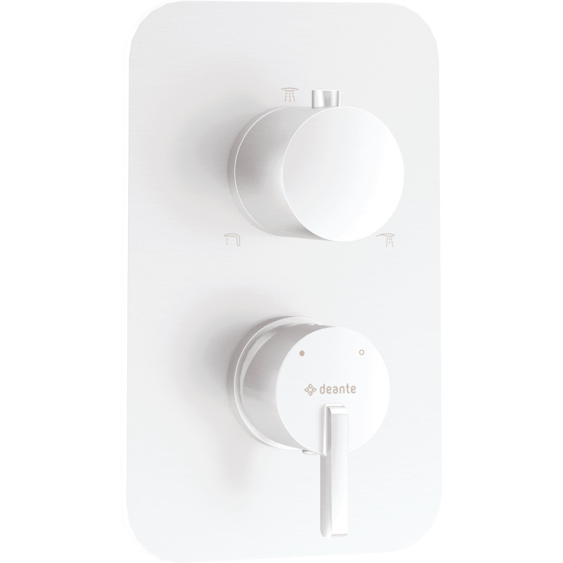 Rozeta została wykonana z trwałego mosiądzu i pokryta matową, białą powłoką Bianco, która dobrze wygląda i łatwo utrzymać ją w czystości. Montaż podtynkowy ukrywa mechanizm w ścianie, pozostawiając na widoku jedynie estetyczne elementy sterujące.