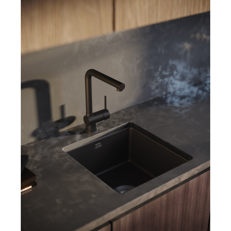 Nowoczesna i praktyczna – taka jest Aster w eleganckim, matowo-czarnym wykończeniu. Wysoki korpus oraz wyciągana wylewka ułatwiają wszystkie prace przy zlewie: od płukania warzyw i owoców, przez napełnianie dzbanków i wysokich garnków, po wygodne mycie nieporęcznych naczyń. Boczna, jednoręczna dźwignia pozwala na wygodne sterowanie strumieniem nawet nadgarstkiem, gdy dłonie są zajęte.