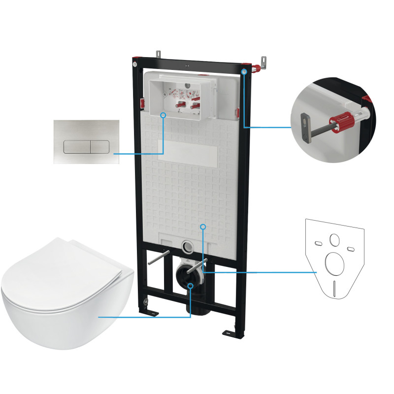 Praktyczny i elegancki pakiet do zabudowy podtynkowej zawiera wszystko, czego potrzebujesz: wiszącą miskę WC Peonia z deską, solidny stelaż oraz minimalistyczny przycisk spłukujący. Bezkołnierzowa konstrukcja miski z gładkimi, zaokrąglonymi krawędziami ogranicza miejsca gromadzenia się zabrudzeń, co ułatwia utrzymanie perfekcyjnej czystości. Deska w zestawie jest wolnoopadająca, a stelaż oferuje ciche, podwójne spłukiwanie 3/6 l. Płaski przycisk w wykończeniu szczotkowanej stali świetnie komponuje się z nowoczesną armaturą i dodatkami.