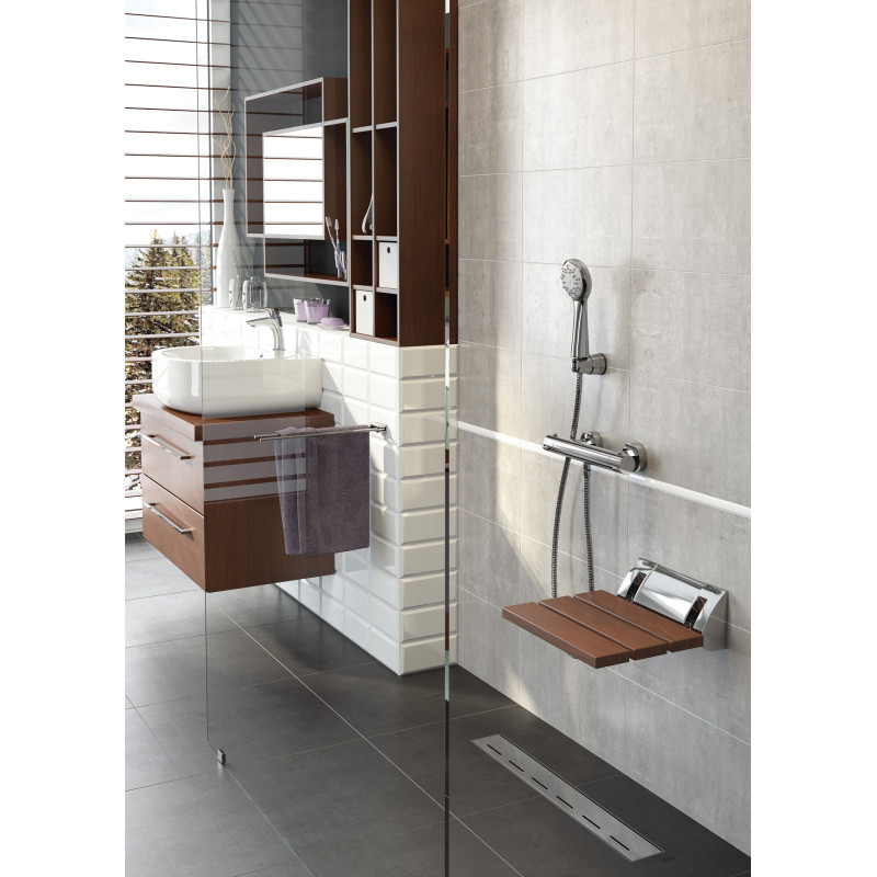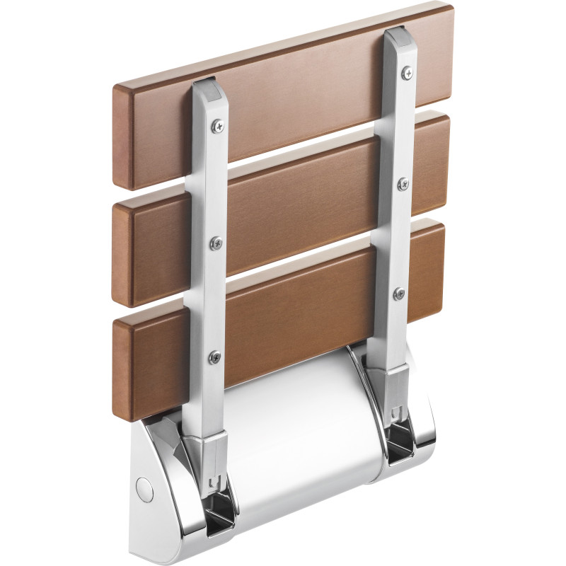 Praktyczne siedzisko prysznicowe stworzone z myślą o osobach z ograniczoną mobilnością. Po rozłożeniu zapewnia wygodne i pewne podparcie, a po złożeniu zajmuje minimum miejsca w kabinie. Solidna kombinacja kompozytu i aluminium sprawia, że siedzisko jest trwałe, odporne na wilgoć i codzienne użytkowanie, a eleganckie brązowe wykończenie harmonijnie dopełnia aranżacje łazienek.