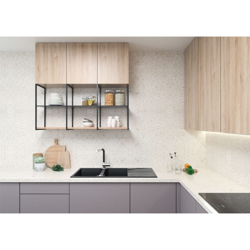 Materiał odporny na intensywne użytkowanie chroni powierzchnię przed zarysowaniami, przebarwieniami, szokiem termicznym i temperaturą do 250°C. Hydrofobowa struktura odpycha krople wody, dzięki czemu zlew szybciej wysycha i łatwiej utrzymać go w czystości. To doskonały wybór do kuchni, w których liczy się ergonomia, estetyka i solidność na lata.