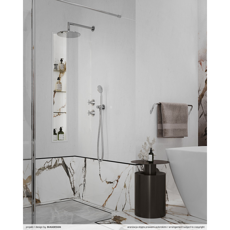 Elegancki, kompletny zestaw prysznicowy podtynkowy, który łączy klasyczne wzornictwo z nowoczesną funkcjonalnością. Błyszczące wykończenie w kolorze chromu nadaje łazience ponadczasowy charakter, a ukryty montaż zapewnia perfekcyjnie uporządkowaną przestrzeń.