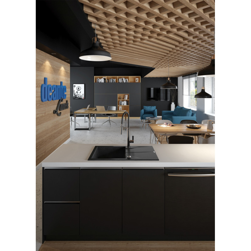 Przestronna misa zlewu ułatwia manewrowanie naczyniami i akcesoriami kuchennymi. Głębokość komory sprzyja wygodnej pracy i ogranicza rozchlapywanie, a matowa, grafitowa powierzchnia nadaje całości szlachetnego charakteru.