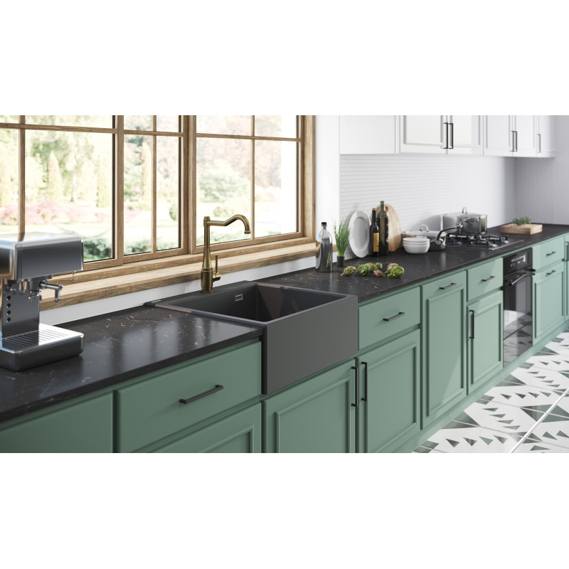 Eridan to farmerski zlewozmywak z charakterystycznym fartuchem wysuniętym przed linię szafek. Taki front pozwala podejść bliżej do komory, zwiększa wygodę pracy przy blacie i ogranicza ryzyko zachlapań. Korpus wykonano z wytrzymałego granitu o matowym wykończeniu – materiału odpornego na zarysowania, przebarwienia, wysokie temperatury i nagłe zmiany ciepła.