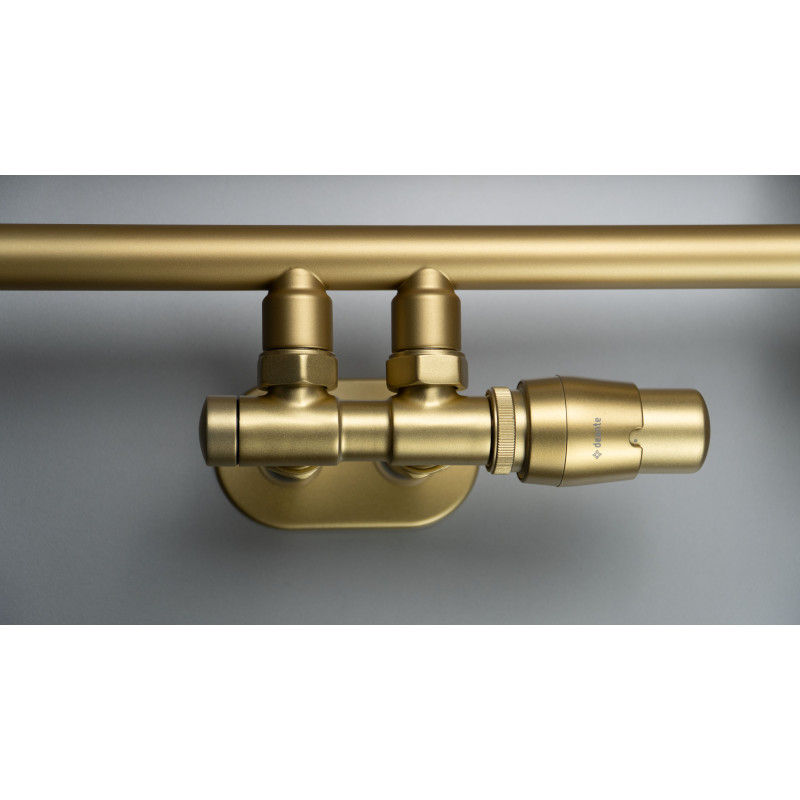 Spójna stylistyka – dopasowanie koloru grzałki, haczyka i zaworów do złotego matu grzejnika tworzy harmonijną, elegancką całość.